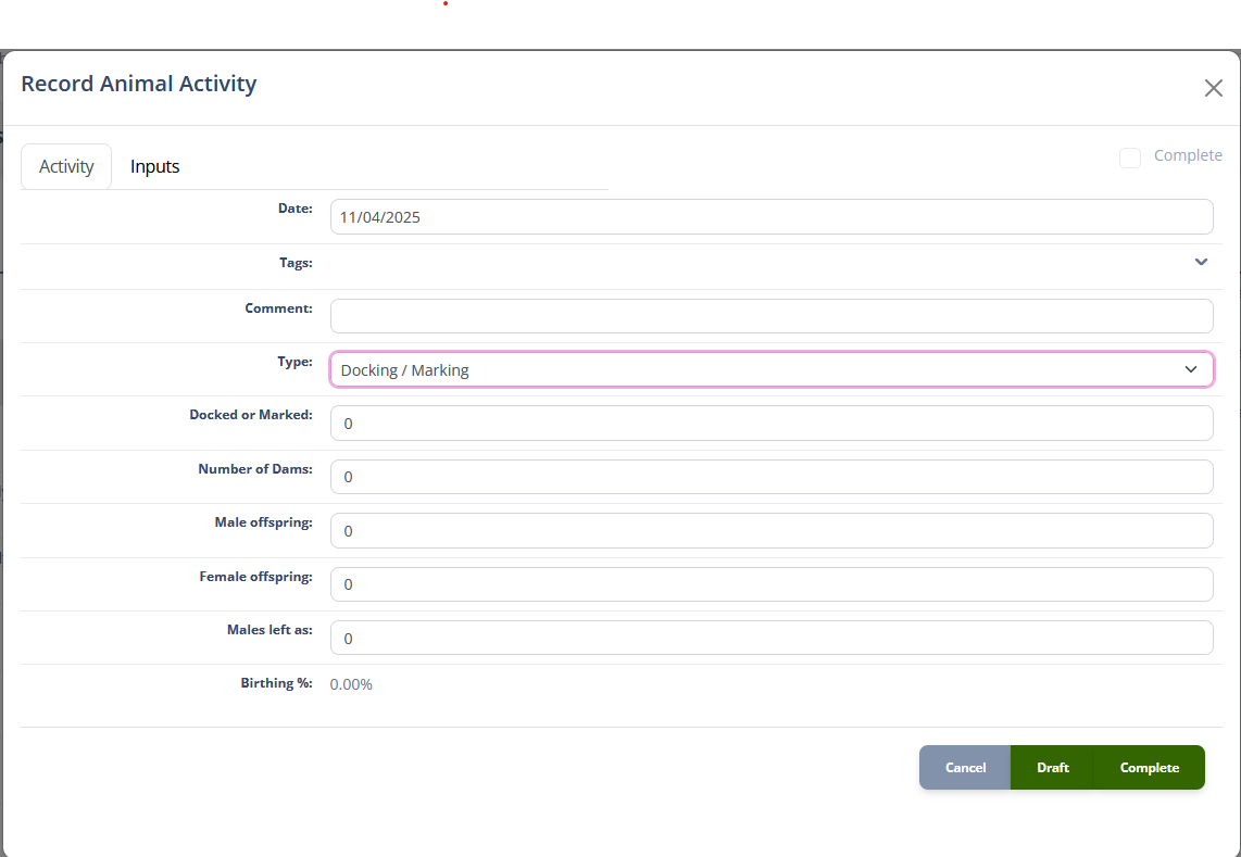 | Docking / Marking | Record docking or marking animals (offspring) | |