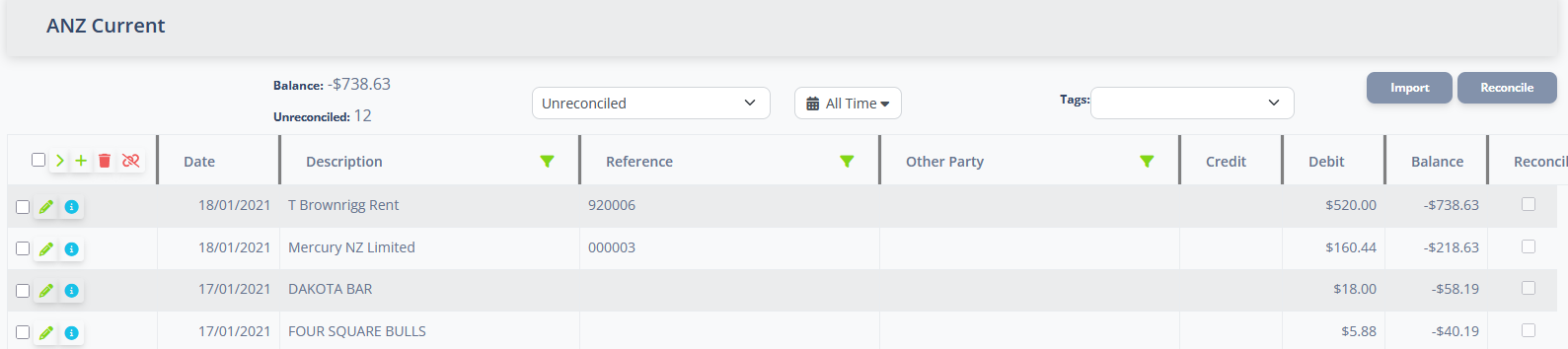 The Bank Transactions page enables you to record bank transactions and import bank them from your online banking accounts so you can track the flow money into and out of your business.