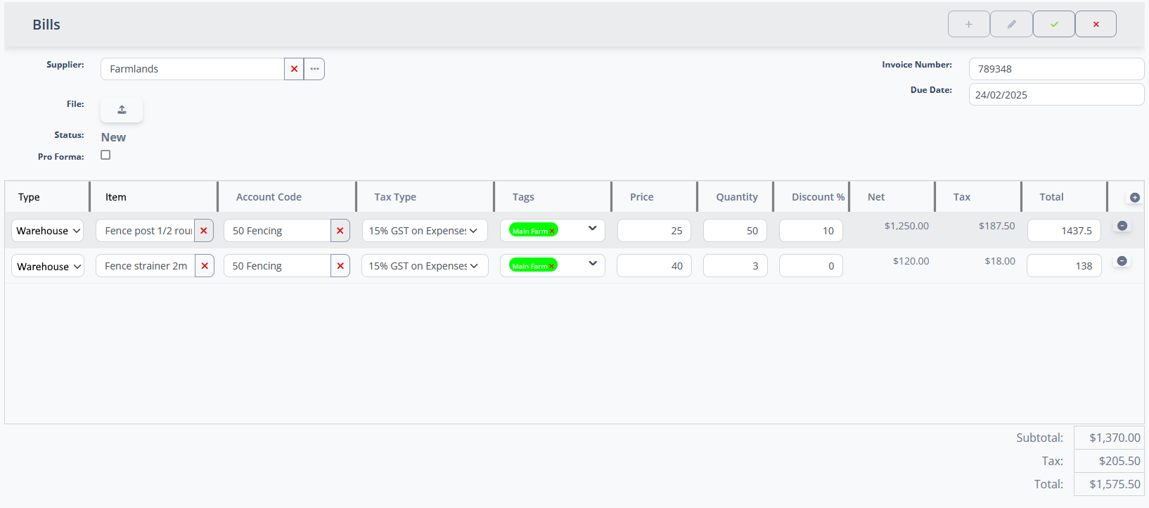 Optionally, each line item can be linked to a Stock Item record in the system. This allows you to track not only the financial impact of purchases, but also account for the resulting changes in the stock levels of input product to your farm.