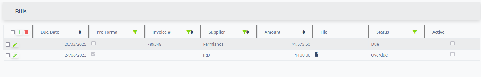 The bills list displays a list of all the bills (supplier invoices) recorded in the system. From here you can view and edit bills and record new bills.