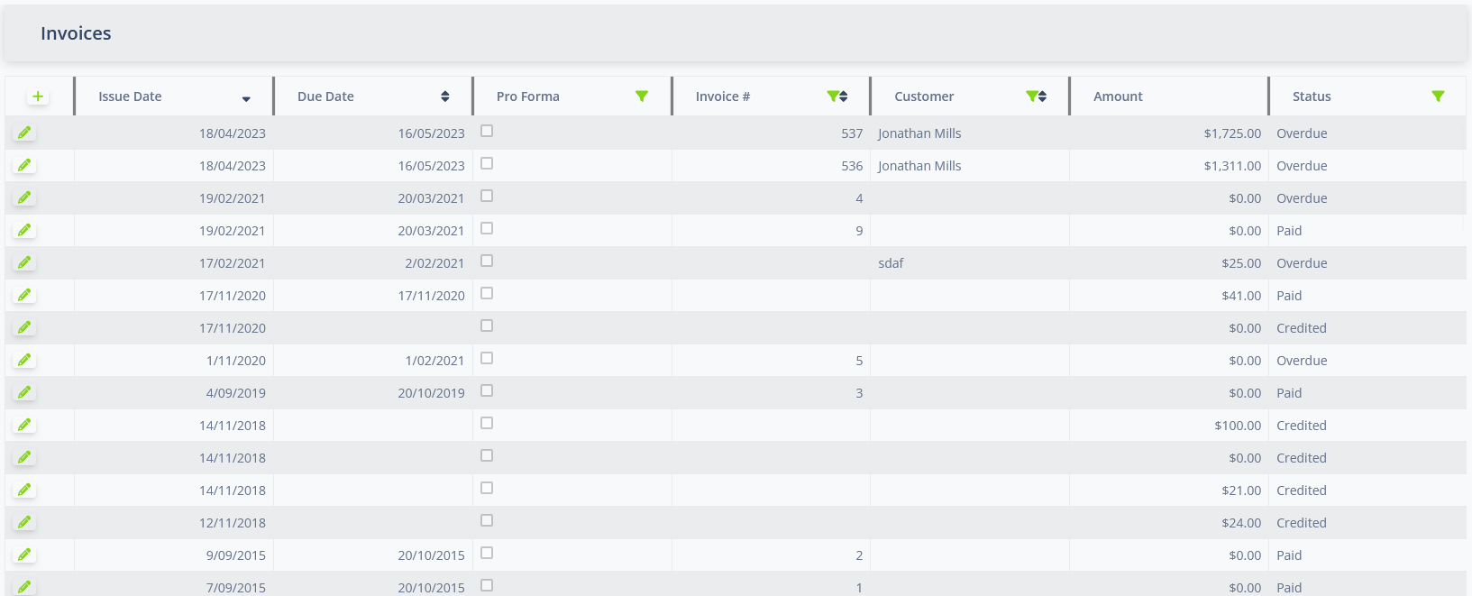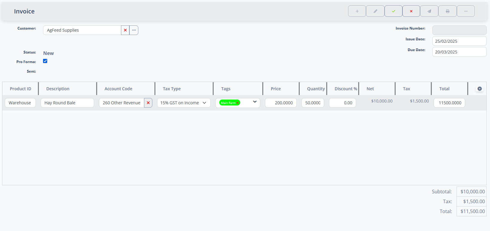 When an invoice is in a Pro Forma state, executing the Issue action will remove the proforma status and update the Issue Date to the current date. This will also cause an invoice number to be assigned.