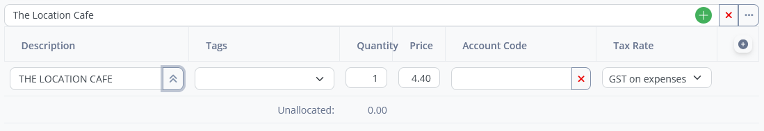 Because different banks record information about a transaction in different ways, this will often be a subset of the information available from the bank statement. Clicking the icon will reveal all the available information for the transaction.