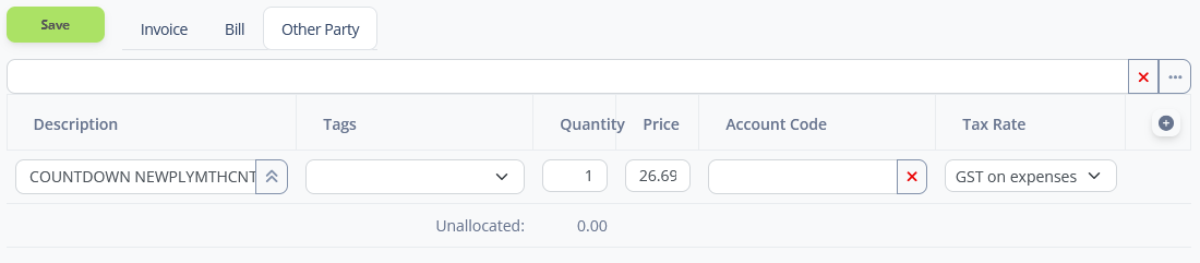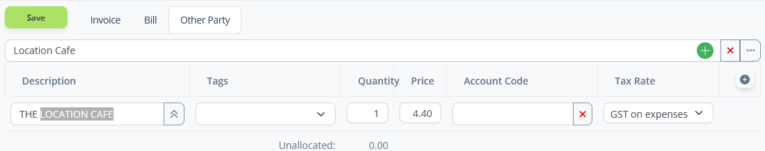 If there is no Bill or Invoice the bank transaction should be matched against, it can be matched directly to an Other Party record. If the system finds a match with an Other Party, it will use the Account code for withdrawals or deposits as a default for the bank transaction line items.