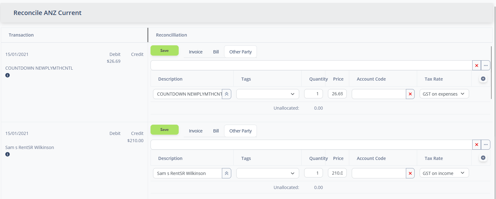 The Reconciliation page enables you to reconcile bank transactions by linking them to Account Code, Sales Tax Rate and Other Party records. The process of reconciliation is critical to understanding how money was earned and spent in your business.
