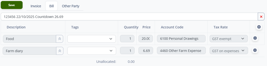 A reconciliation can only be saved when an account code has been assigned and the unallocated value is zero.
